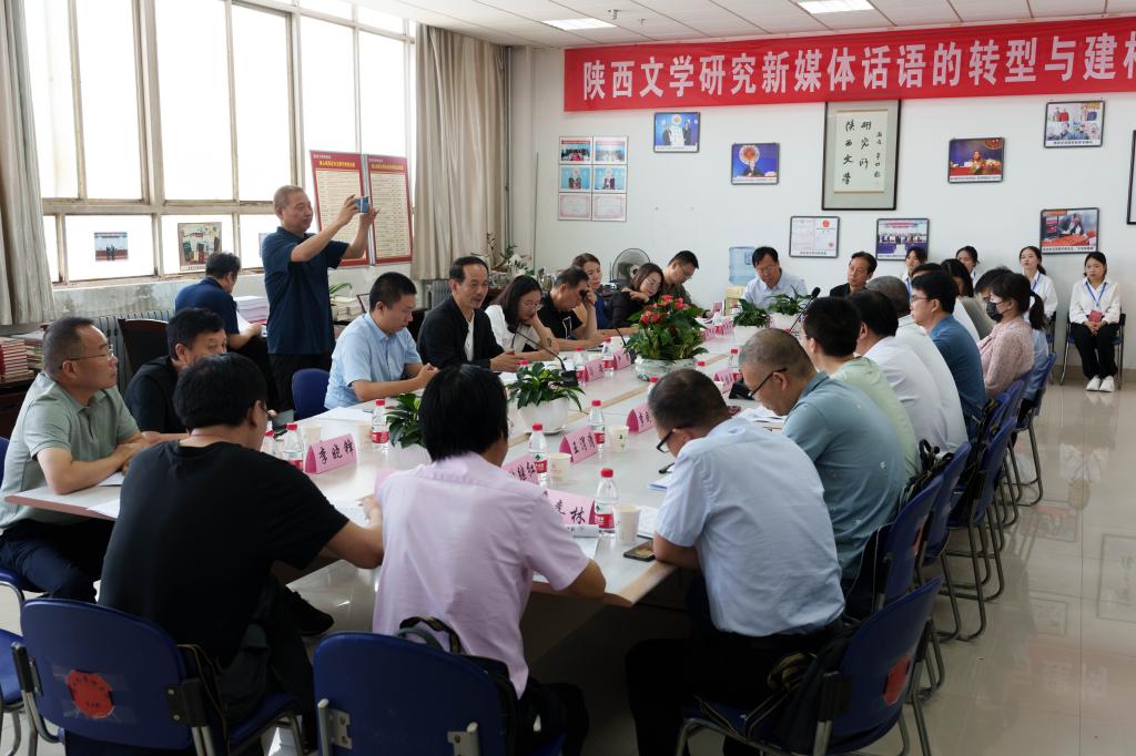 欢迎仪式之后,陕西文学研究所举办的“陕西文学研究新媒体话语转型与建构”学术研讨会正式开始。会议由校陕西文学研究所所长孙新峰主持。来自文学与新闻传播学院相关学科专家、学者,以及省内邀请的20余位作家、文艺评论家、学者一起进行了热烈的研讨。阎安先生一行也兴致勃勃地全程观摩了研讨。