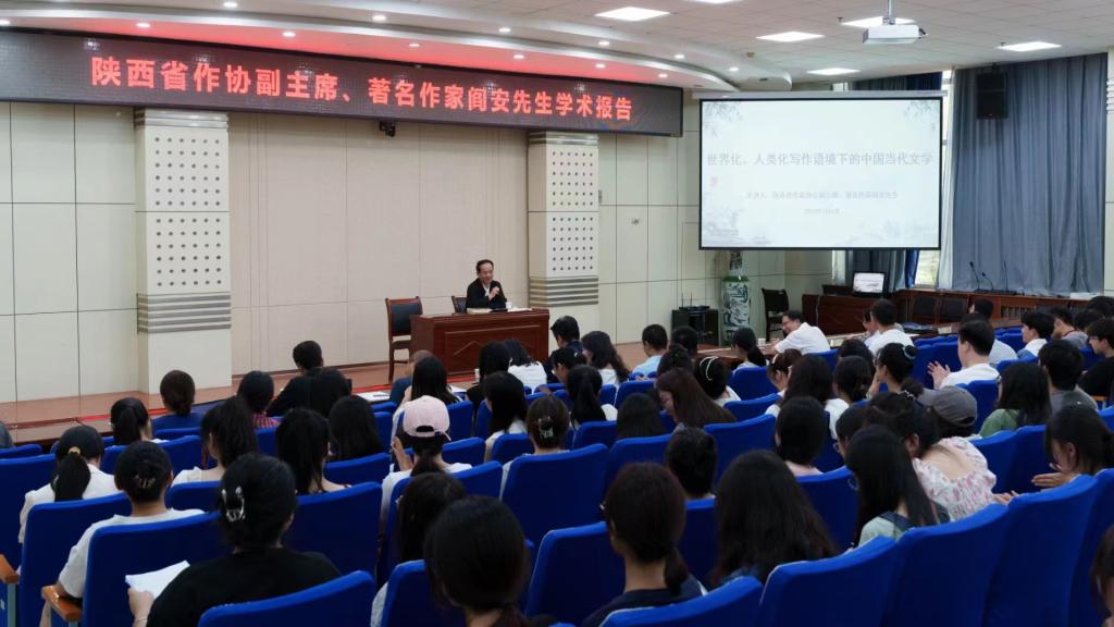 下午16:30,著名作家、陕西省作协副主席阎安学术讲座在学校木铎厅进行。讲座题目是《世界化、人类化写作语境下的中国当代文学》。报告会由文学与新闻传播学院副院长、校陕西文学研究所所长孙新峰主持。我校文传学院中国现当代文学学科老师、宝鸡市20余名作家、评论家,以及2021级、2022级研究生、本科生听取了报告。