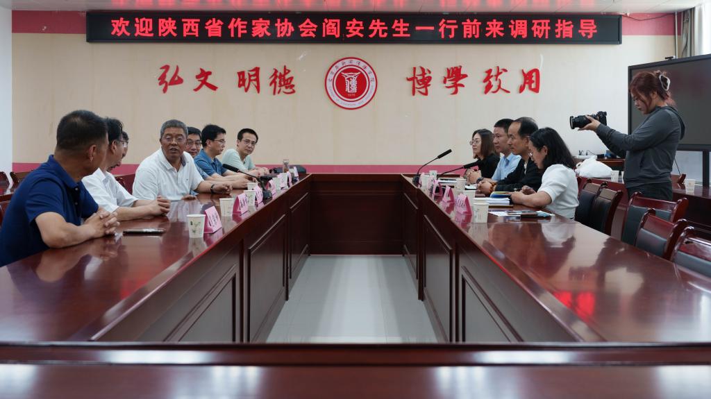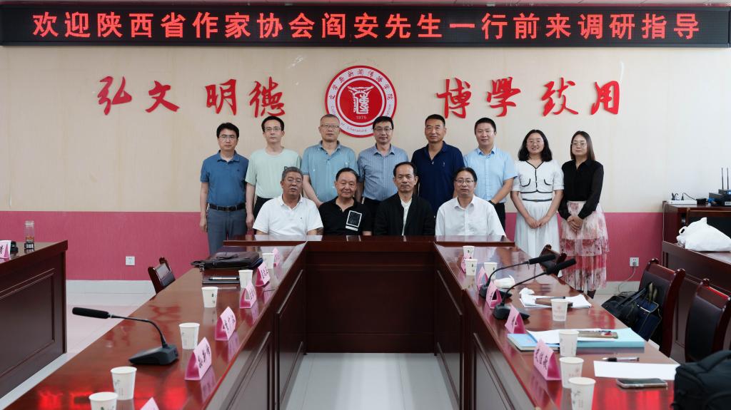 2023年7月4日,著名作家、陕西省作家协会副主席、《延河》杂志社社长、执行主编阎安等一行7人前来我校,先后来校陕西文学研究所、文学与新闻传播学院进行调研。文学与新闻传播学院院长兰拉成、副院长、校陕西文学研究所所长孙新峰,副院长孟改正、中文系主任李剑清、中国现当代文学学科带头人郭文元、现当代文学教研室主任李雅妮、文艺学教研室主任王永奇、语文教育学科带头人王渭清、中国现当代文学学科骨干张继红、王俊,校陕西文学研究所专职研究员马平川、以及宝鸡市作家协会主席李广汉等领导、老师,以及我院文艺学、中国现当代文学等相关学科研究生参加了调研活动。