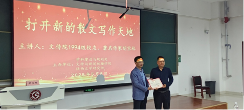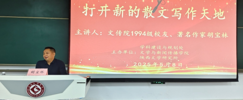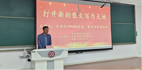 5月8日晚,文学与新闻传播学院1994级校友、著名作家、《宝鸡日报》文体部主任胡宝林应邀在高新校区博文楼副楼105报告厅作了题为《打开新的散文写作天地》的文学创作报告。我院师生200余人聆听了报告。报告会由陕西文学研究所所长孙新峰主持,文学与新闻传播院长孟改正致欢迎辞。