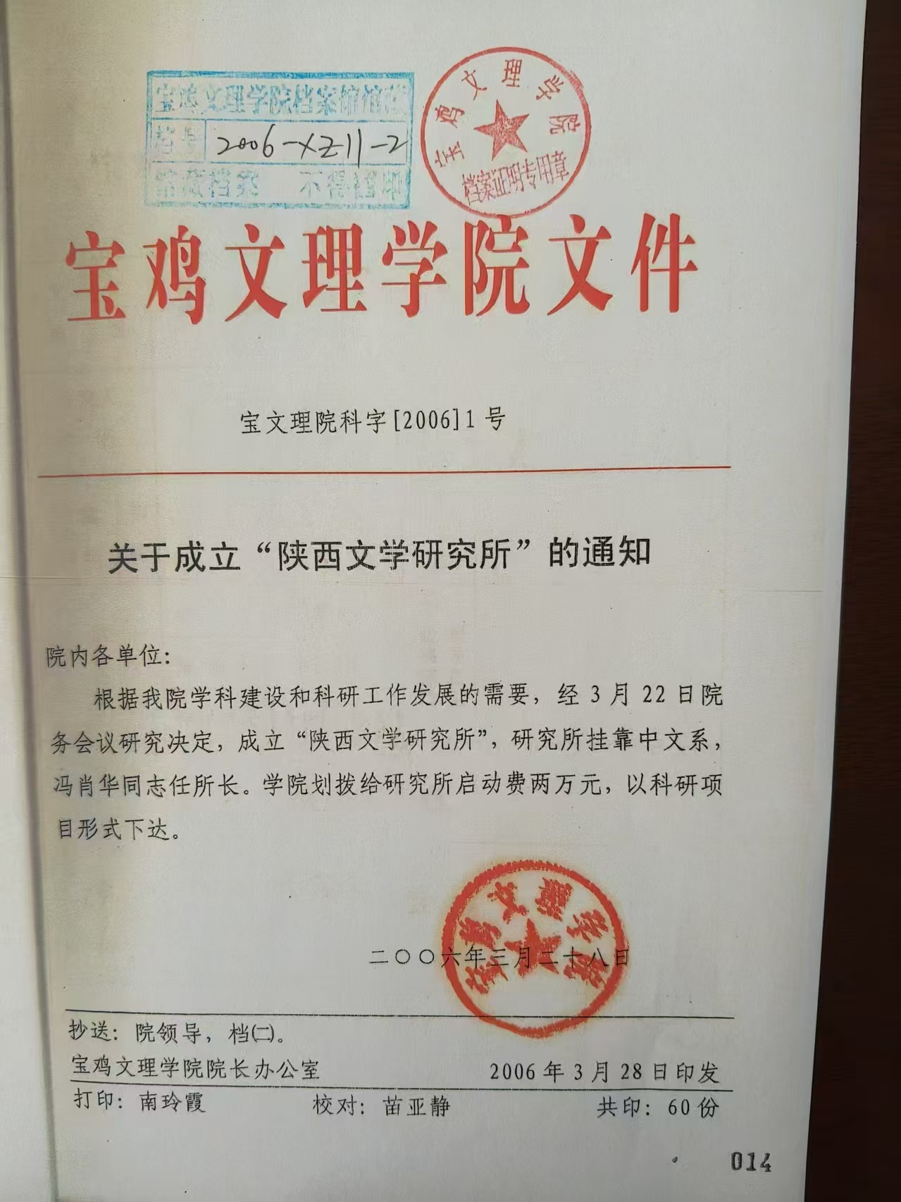 2006年3月陕西文学研究所成立文件