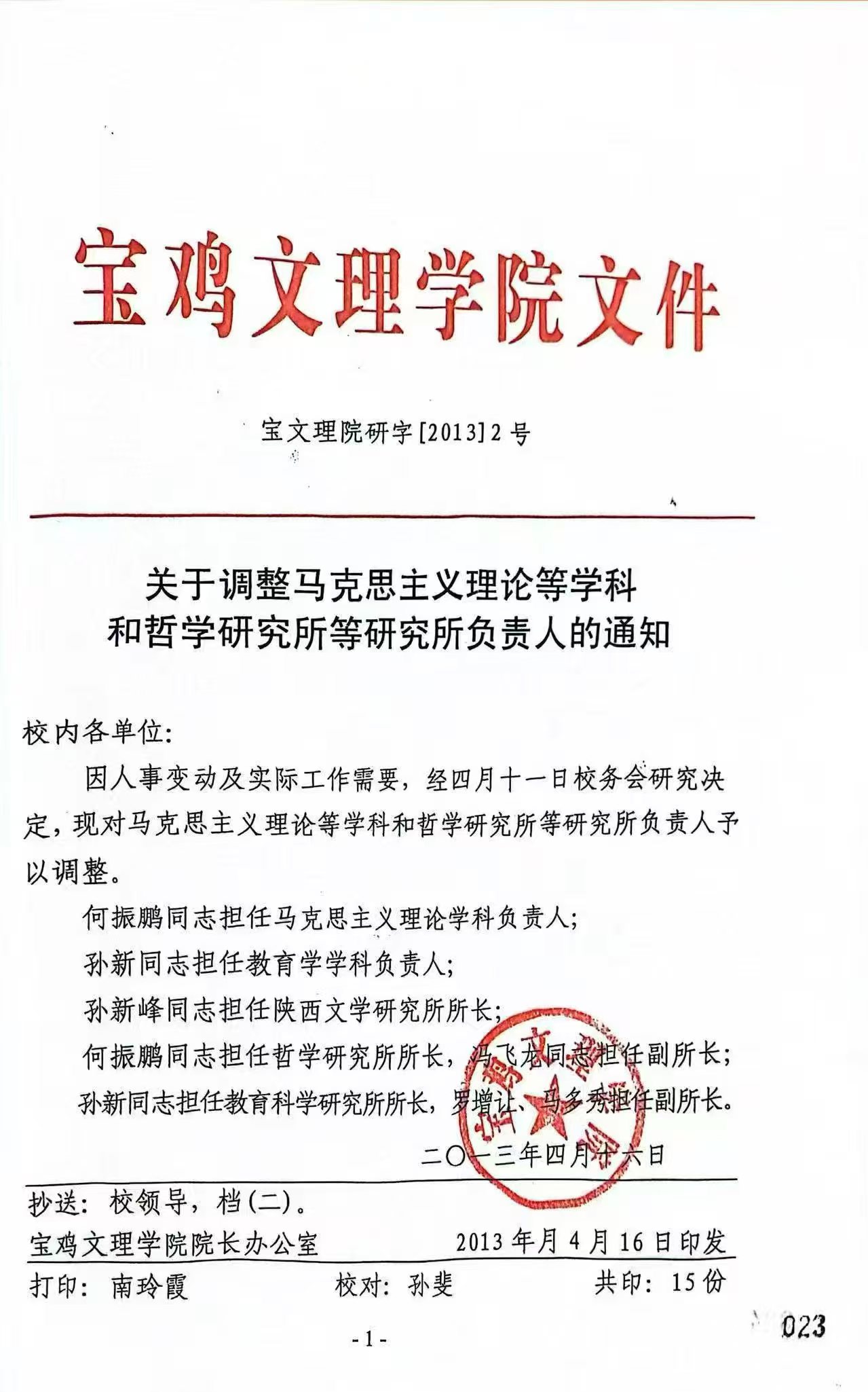 2013年4月,孙新峰继任陕西文学研究所所长文件